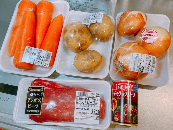 然後,在電子鍋中放入洋蔥、馬鈴薯、紅蘿蔔與牛肉(可先用鹽與胡椒簡單醃製)。